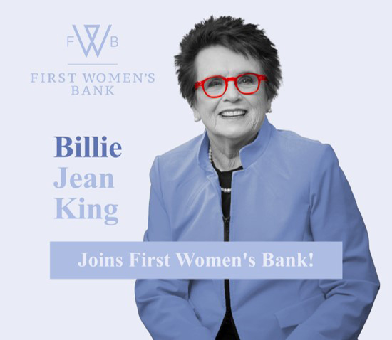 A critical step toward achieving gender equality is creating economic parity and financial inclusion, which requires closing the racial and gender gaps in access to capital. I look forward to joining First Women’s Bank as we work to bridge those gaps and empower women from all walks of life to reach their full potential.Billie Jean King, Strategic Advisor